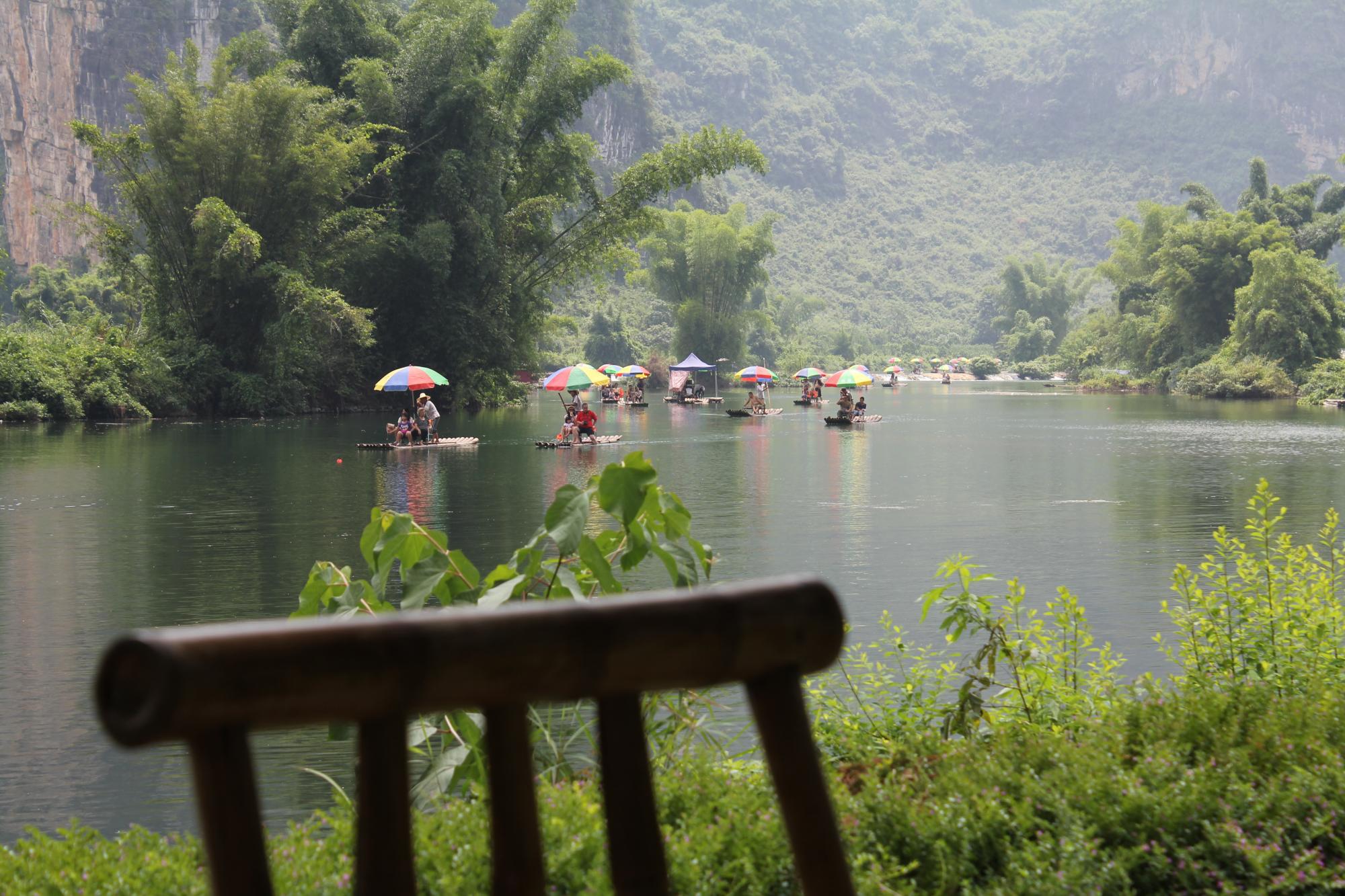 … terwijl meer dan 100 bamboe vlotten per uur de rivier afzakken…