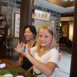Het theehuis waar Mei en mrs Lee ons mee naartoe namen was duidelijk te luux voor ons; prachtig ingerichte salon, waar we allen plaatsnamen om een tafel met een gastvrouw-thee-schenkster die op de meest kunstige wijze heeeel kleine kopjes thee voor ons inschonk. Wij wilden goed proeven en ruiken maar kwamen er al snel achter dat we ons als barbaren in china gedroegen: waar we eigenlijk met drie slokjes per kopje en veel aandacht hadden moeten drinken, sloegen wij goedbedoeld natuurlijk de -overigens erg lekkere!-thee achterover. Vader Wang kwam ons vergezellen en de gastvrouw leerde J en F hoe de kopjes op de juiste wijze te draaien. Het was echt geweldig, we hebben gevorderde plannen om in Nl ook een theehuis te starten.
