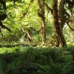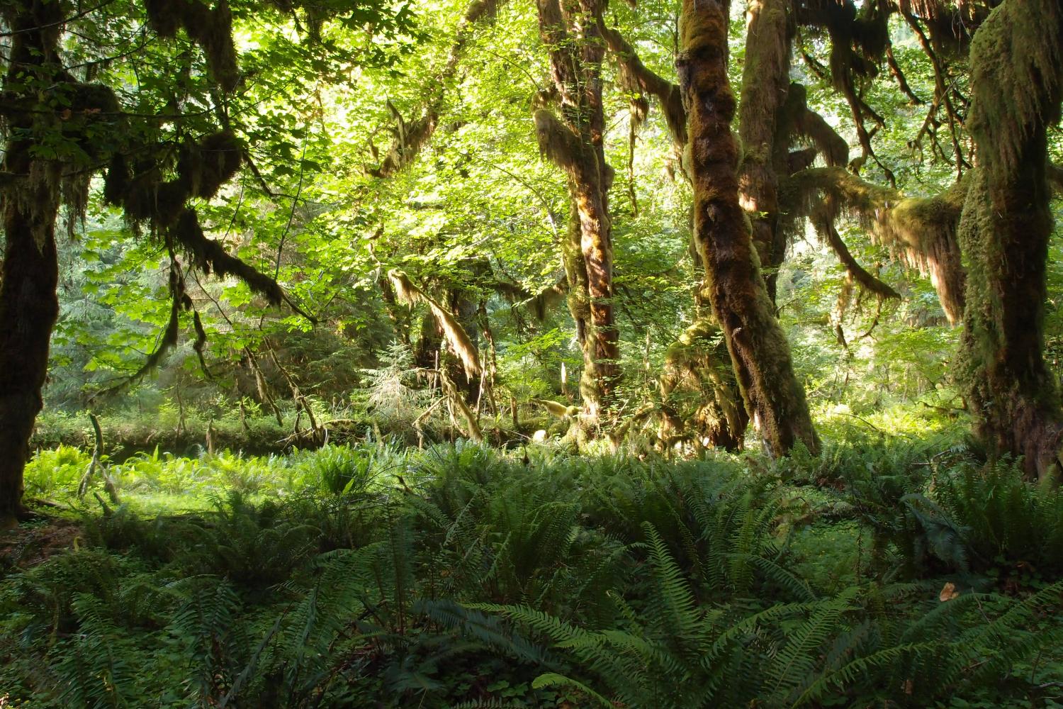 Toen naar het Hoh rainforest gereden door het indrukwekkende Olympic forest. Bomen zijn hier groot, 70 m hoog is niks en 1 op de 10 bomen heeft een diameter van meer dan 2 meter. Het bos in het park ( zo groot als Drenthe?) is met rust gelaten: de gevallen reuzen liggen dwars op hun broeders mooi weg te rotten en daarop groeit de nieuwe generatie bomen alweer op. Daaronder een heel prehistorisch ogende vegetatie. In het Hoh regenwoud middenin het park zijn de bomen begroeid met mos dat vaak in slierten naar beneden hangt, sprookjesachtig. Er schijnt meer dan 3 m regen per jaar te vallen, maar voor ons scheen de zon.