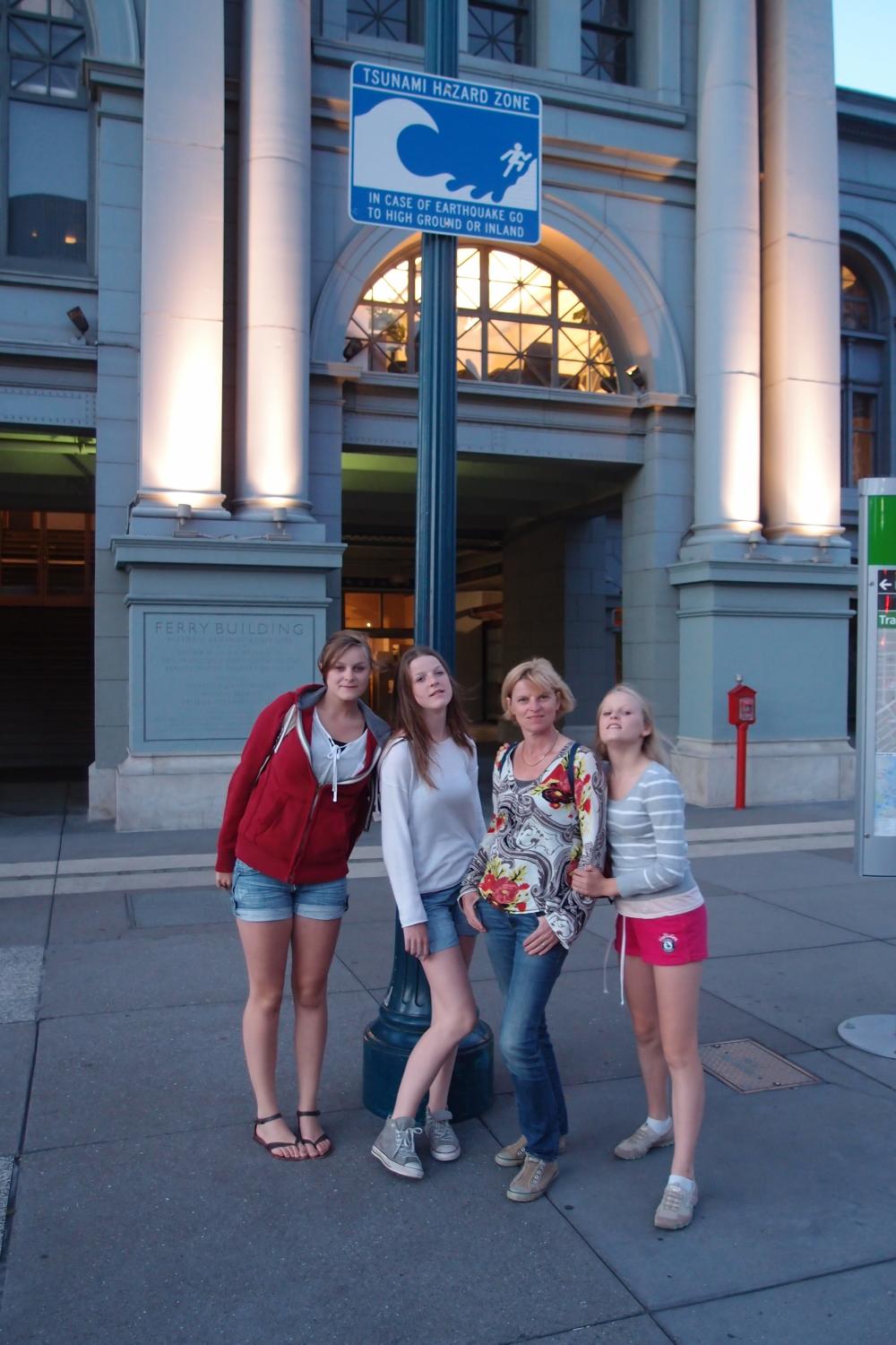 San Francisco is op heuvels gebouwd en de straten gaan dus omhoog/omlaag. Daar hebben ze de Cable cars op verzonnen; Kleine trammetjes die met een kabel de heuvel op getrokken worden. Onderaan de heuvels is steeds een soort draaiplateau waar het karretje dan weer door twee man wordt omgedraaid. Ik denk dat er niets aan veranderd is sinds eind 19 e eeuw. We reden hier al met de metro en trolley bus (ook uit die tijd trouwens) maar de cable car was natuurlijk het leukst. Vooral omdat hij vanwege z’n populariteit snel vol zit en de mensen dan op de buitenrand staand nog meeliften. D&F zorgden er wel voor dat ze zich zo’n buitenkans niet lieten ontlopen en bungelden al snel op de traptree. De geweldige (in fysiek en humeur) machinist gaf ze tips hoe ze hun plekje best veroverden.