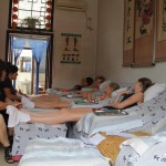 Gister (na een heerlijke nacht op de Kang (stenen bed met vloerverwarming) hebben de dames eerst een voetmassage genoten om daarna op een gehuurde tandem en een trandem rond te fietsen. Verkeer (geen auto’s, maar wel tot taxi omgebouwd golfkarretjes, electrische scooters en motorfietsen) is zoals overal een heerlijke chaos maar wij krijgen de smaak ook te pakken.
