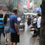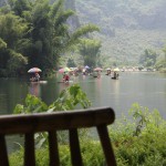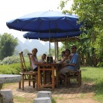 Net gezellig met z’n vijfjes onder een parasolletje aan de rivieroever gelunched. De meisjes zwommen de hele ochtend in de rivier en zijn ondanks veel zonnefactor meer of minder verbrand. De honderden bamboe parasolletjeboevlotjes die hier voorbij bomen vonden de blonde meisjes -as usual- buitengwoon fotogeniek, ” hello!, hello!”